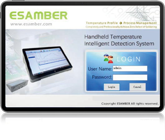ESAMBER掌上型温度智能检测系统,是专业用于返修设备智 能检测系统,具有方便快捷、精度高、运行稳定可靠,操作便 捷等特点。它适用于BGA返修站、热风枪焊台、烙铁温度检测 等。